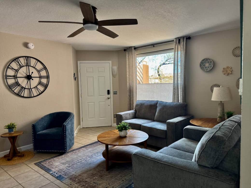 Escape to your ideal desert getaway in this beautifully renovated 2BR/2BA luxury condo located in the prestigious Ventana Canyon community. Freshly renovated and thoughtfully designed, this condo offers a true home-away-from-home experience. Inside, the living space features calming, neutral tones that create a relaxing atmosphere. The fully equipped kitchen boasts modern stainless-steel appliances, while the cozy living room is ideal for winding down with the 65" Smart TV (streaming available with your own login). Bedrooms are designed with your comfort in mind, including USB charging ports built into the nightstand lamps. The home comes stocked with an initial supply of essentials including paper towels, trash bags, K-cups, pantry basics (salt, pepper, cooking oil/spray), toiletries, and laundry/dish supplies. Step out onto the back patio and enjoy your morning coffee or unwind with a good book in this peaceful setting with unobstructed views of Ventana Canyon. A perfect blend of comfort, elegance, and natural beauty awaits.